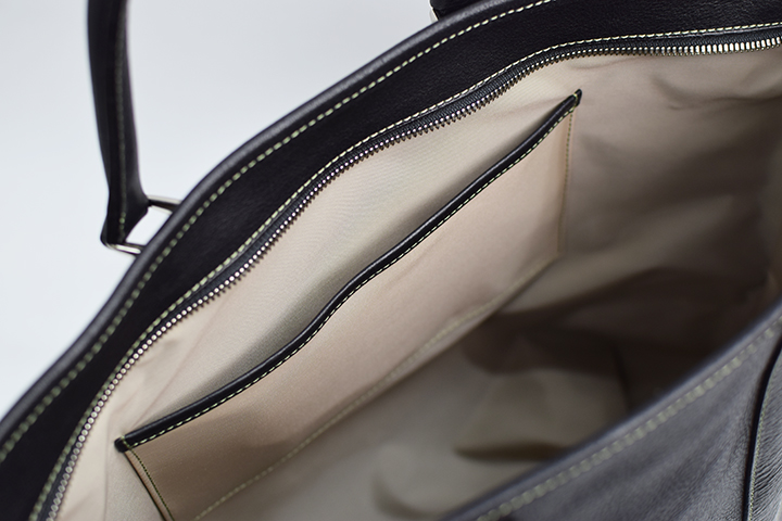 外付けのポケットは備えておりませんが上品な光沢のナイロンをあしらったメイン収納部にはマチ無しの内ポケットを2部屋設けております。