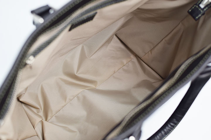 内装はフラボナポーチと同じライトグレーのナイロンを使用しています。明るいカラーで鞄の奥の方も見やすくなる利点もあります。