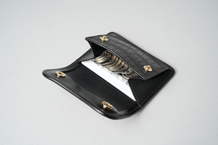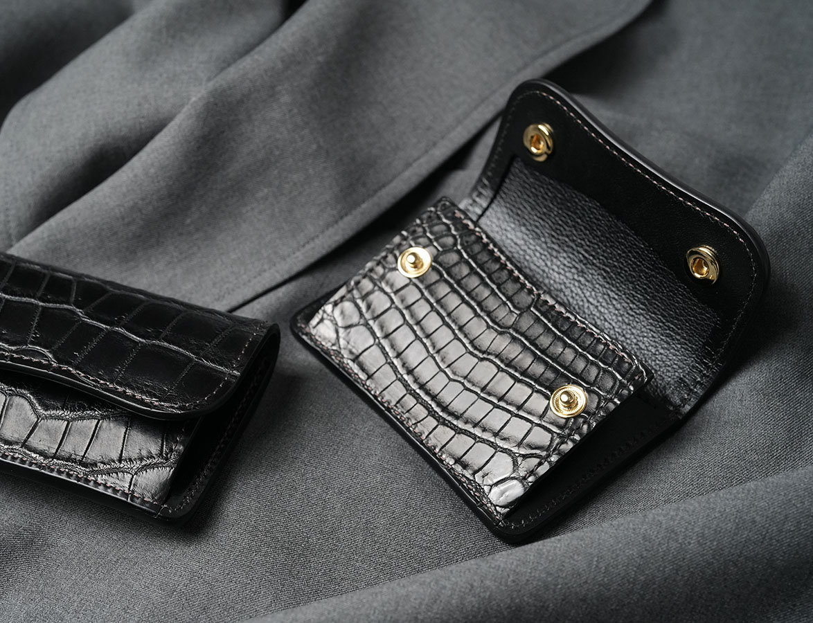 改めて今回ご紹介するTONGUEの「特別」な部分について触れていきます。通常、コインケースの前身部分はサドルプルアップをはじめとした牛革があしらわれますが、特別仕様では、この前身部分においてもブラックのクロコダイルが採用されています。小さなパーツではありますが、こちらもクロコダイルになると製品全体の重厚感が増します。また、ブラックの皮革部分とゴールドのカラーのホックのコントラストは高級感を演出します。