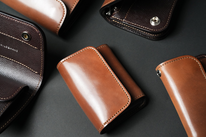 シェルコードバンを手掛けるのは、アメリカのイリノイ州シカゴで100年以上の歴史を持つ伝統的なタンナー、ホーウィン社(Horween Leather Co.)。一般に馬の臀部の繊維層を削りだした皮革をコードバンと呼びますが、ホーウィン社が生み出すそれは「シェルコードバン」と呼ばれています。大手紳士靴ブランドをはじめ、名だたるメゾンで愛される圧倒的なクオリティ、それに対する自信に裏打ちされた唯一無二の呼称は、最高峰のコードバン革として世界に名を轟かせています。絹のように滑らかな肌触りと強い光沢はファンを魅了してやまず、WILDSWANSでも絶大な人気を誇る銘革です。