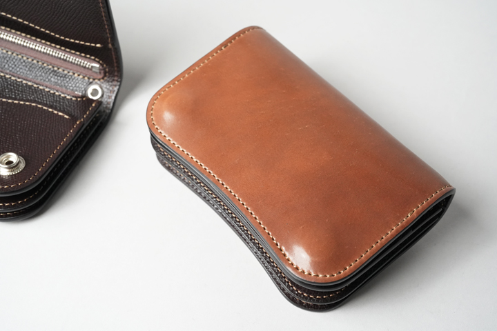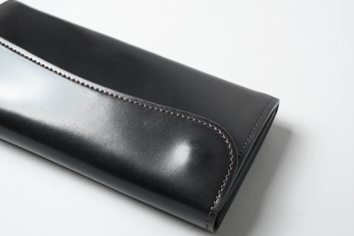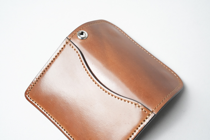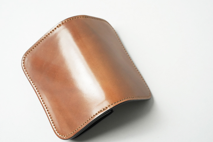 一枚革のシェルコードバンを大胆に使ったENO。折り曲がり部分に逆反りのシワが生じにくいのは、シェルコードバンの特性の一つです。