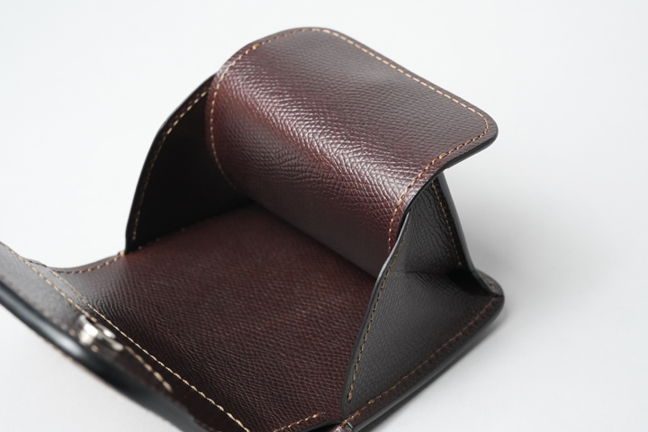 札室はゆとりをもって設計され、一万円札もするりと出し入れができます。型押しサドルプルアップに覆われた内装は、シボ感とステッチがラグジュアリーな雰囲気を引き立てています。