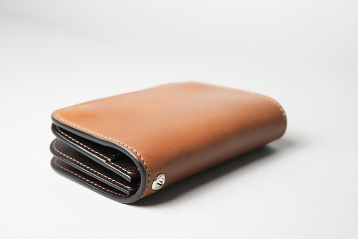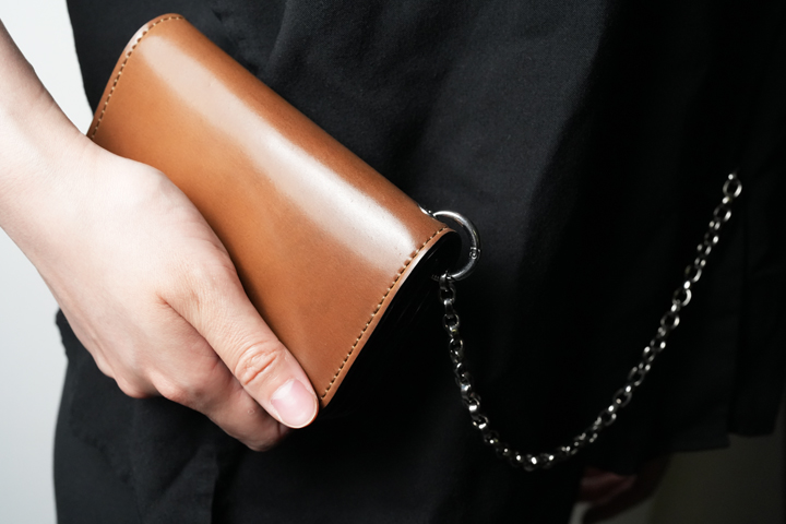ミニ財布とまではいきませんが、片手に収まる扱いやすいサイズです。画像ではハトメにウォレットチェーンを取り付けており、金具との親和性の高さがお分かりいただけるかと思います。
