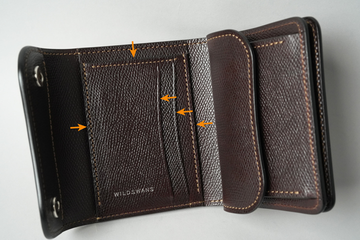 型押しサドルプルアップをたっぷりと使った内装にライトブラウンのステッチが縦横無尽に走り、高級感と同時にクラフト感も漂っています。TONGUEと同程度の大きさのコインケースが備わり、カード収納部には矢印方向に計5枚が収納可能です。