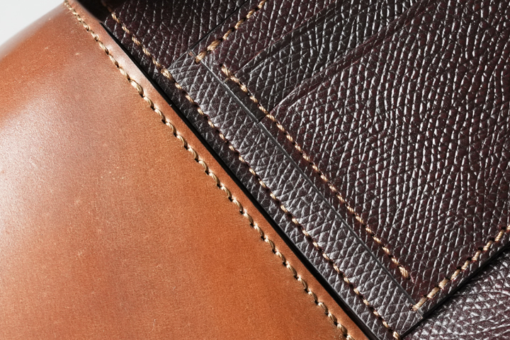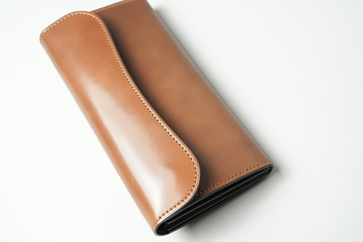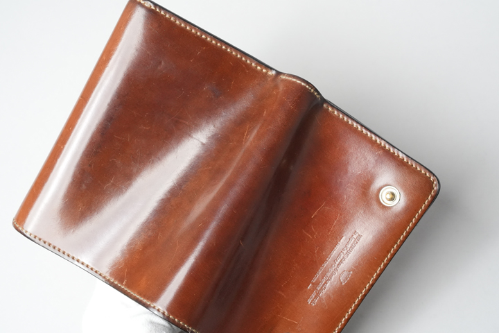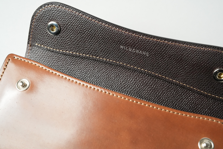 外装は一枚革のシェルコードバンで形成され、つるりとした質感をダイレクトに感じていただけます。フラップに留め具はありませんが、使用とともに皮革が馴染むことで、次第にぴったりと閉じるようになってまいります。