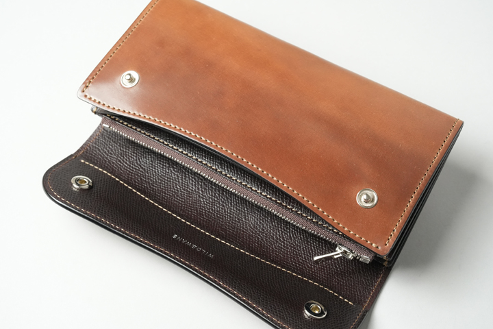 こちらも一枚革のシェルコードバンを使った贅沢なアイテム、大型長財布のWAVEです。シルバーのロゴは、内装のバネホック間に刻印されています。