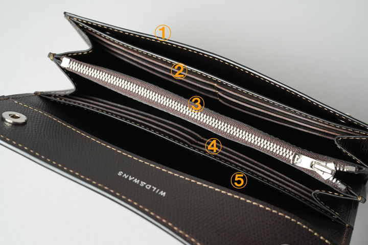 ① 、⑤・・・マチなしポケット。紙幣や領収書の収納に適しています。