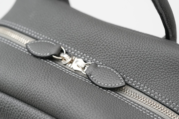 ファスナーエンド部分の少し下には革のツマミが配置されていますので、ファスナーを開くときなどにはここをつまんで操作すると力が入りやすくなっています。