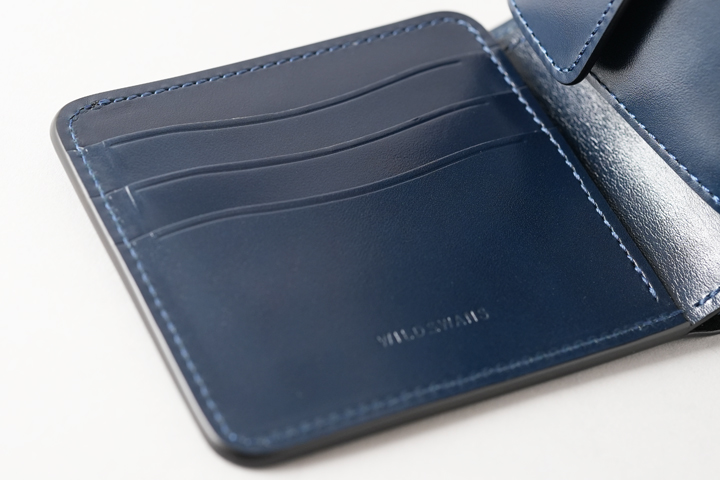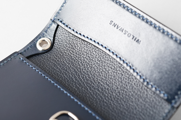 外装に収納部は持たないスマートなデザインで、現行のWILDSWANSの名刺入れの中で唯一フラップにホックが付いたモデルです。