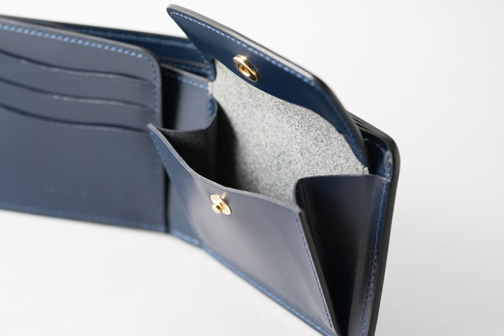 コインケースはフラップ式で、左右にはマチを設けた容量の豊富なケースです。 ケース内部は革の床面を活かしたデザインになっています。