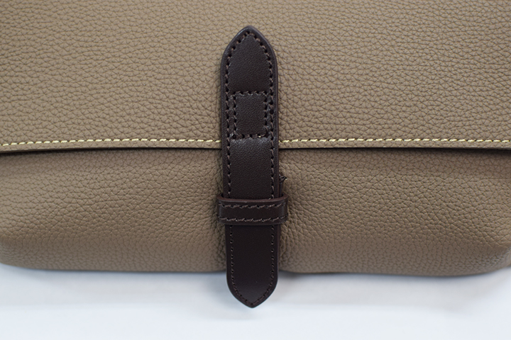 不用意にフラップが開かないようにフラップの中央には革の留め具が付けられています。