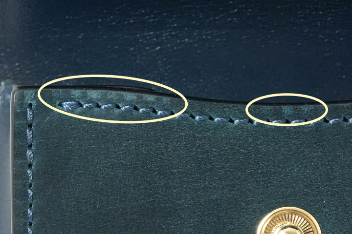 (シェルコードバン フラップのステッチが密着したことによるザラつきや色落ちの様子)