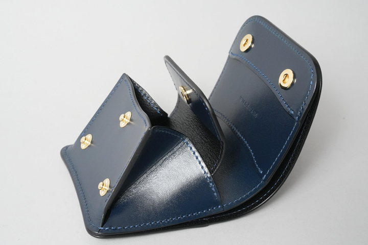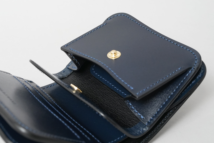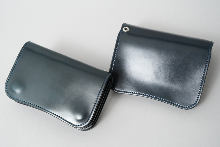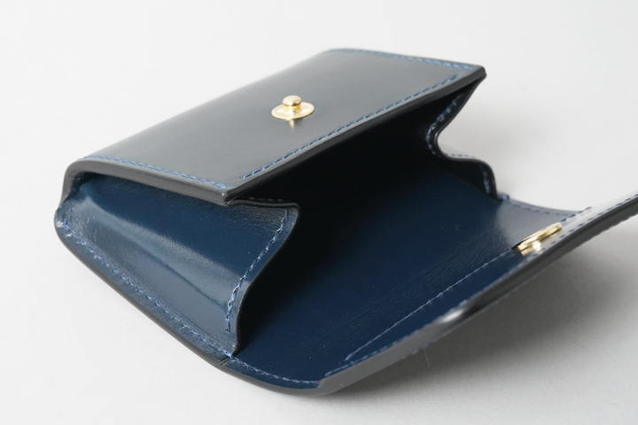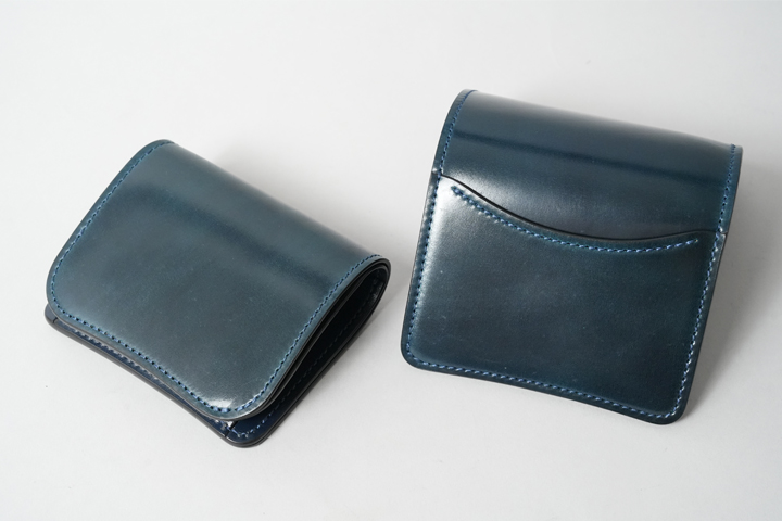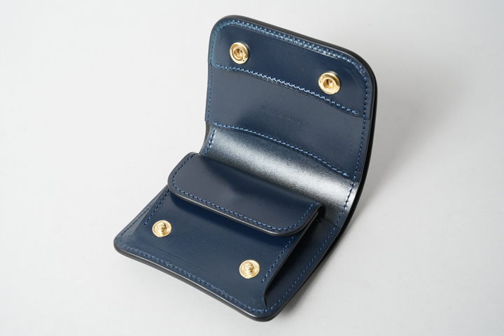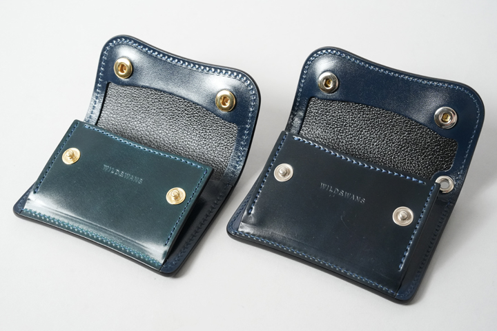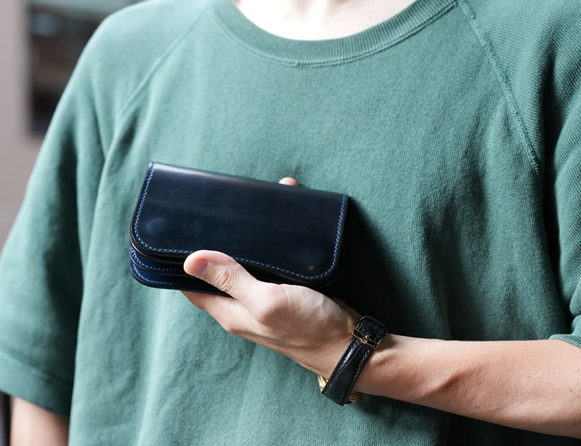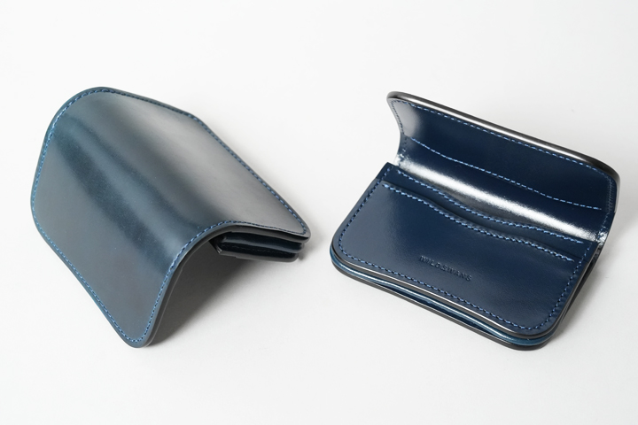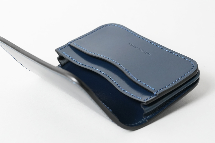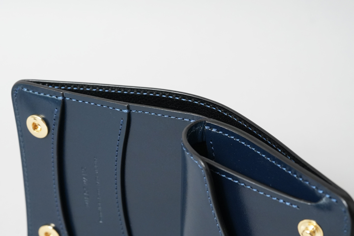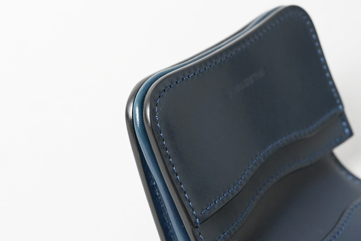 シェルコードバン/インテンスブルーの内装には、サドルプルアップレザーの特別カラー/フレンチネイビーを合わせています。堅牢で耐久性が高いベルギー牛革・サドルプルアップはWILDSWANSの定番素材として長く愛されている皮革です。フレンチネイビーはしっとりと落ち着きを感じる雰囲気をまとっており、シェルコードバン/インテンスブルーと組み合わせることで調和のとれた製品に仕上がりました。