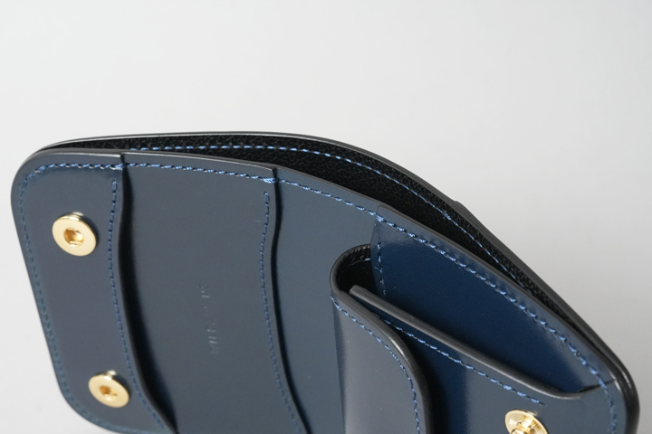 内装下部は手前から、マチ無しポケット、ファスナー付きコインケース、マチ無しポケットが設けられています。 奥側のマチ無しポケットは口元が船形に開き、深さも確保されているので、二つ折りの紙幣やレシート等を収納することが出来ます。