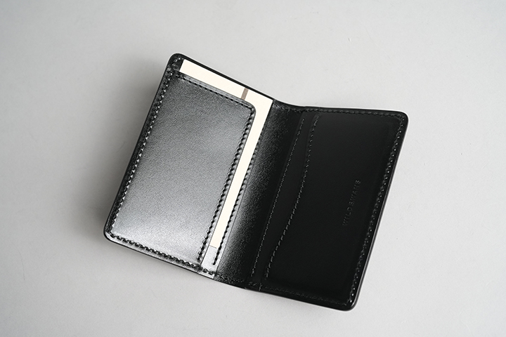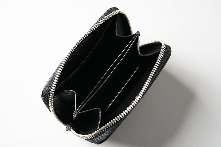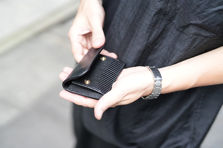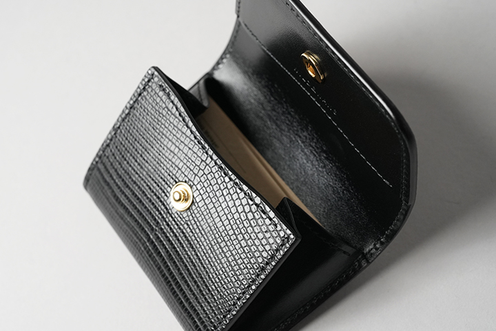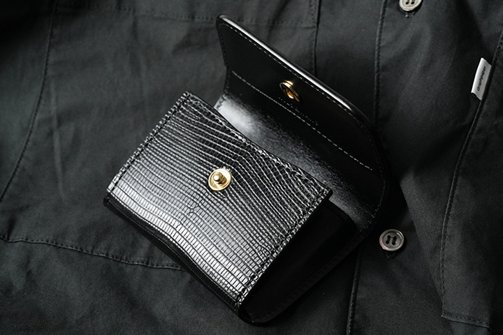 カードケースあるいはコインケースとしても使用できるマルチなアイテムのARTHURもWILDSWANSでは小振りな部類に属するアイテムです。リザードを使用したフラップから背面まではポケットがなく、シンプルかつミニマルな外観が特徴です。フラップの中央に配置した1点のホックを外すとメイン収納部が現れます。カード類は背面側に収納しますが、名刺だと約30枚、プラスチック製カードでは約15枚がこちらに収納可能です。前身側にカードの収納はできませんが、代わりにコインやSDカードなどが収納できます。鱗が小振りなリザードはクロコダイルよりも控え目なイメージであることに加えて、今回はブラックでのカラー展開となっていることからビジネスシーンでもマッチしやすいアイテムに仕上がりました。
