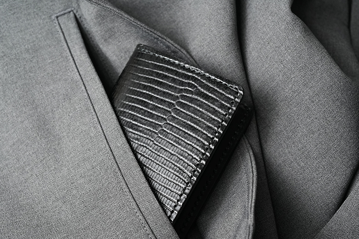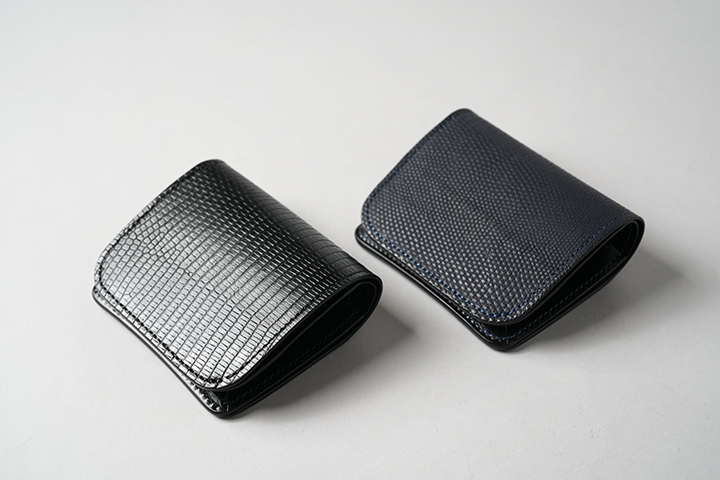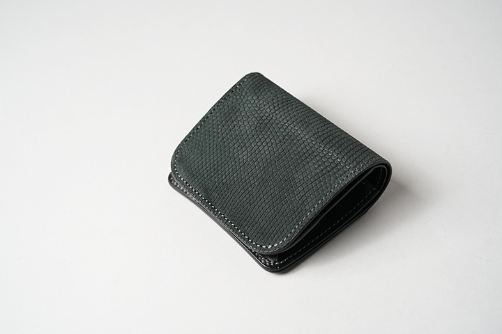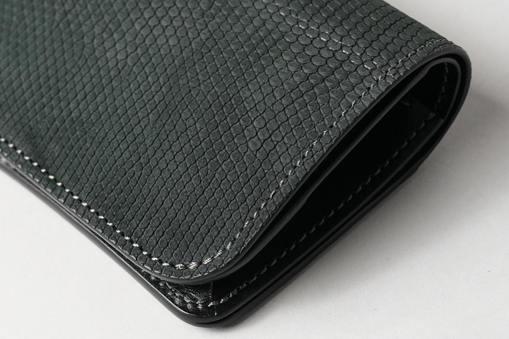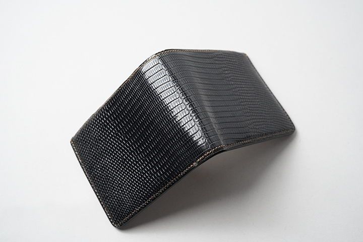 PLAM-V2とは異なる特性を持つCASAも当シリーズに登場します。一見するとPALM-V2とよく似た外観のCASAですが、本体上部の折り曲げ部分からフラップの先端にかけて少しシェイプするようにデザインされている点が外観の相違点です。CASAにも背面にカードポケットを備えています。フラップとその下のパーツには意図的に段差を設けることで、フラップが指に掛かりやすい設計が採用されています。内装においては、コインケースに専用フラップを備え、さらにこのコインケースは両サイドの大きなマチを前後に可動します。この仕組みによって、フラップの手前にコイン、奥に6~7枚のカードをまとめて収納することができます。本体サイドの札室は裏貼りが施され、すべての日本紙幣の出し入れもスムーズです。コンパクトであるからこそ、リザードの存在感が引き立つCASAのご紹介でした。