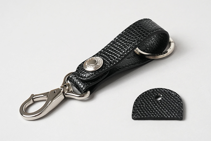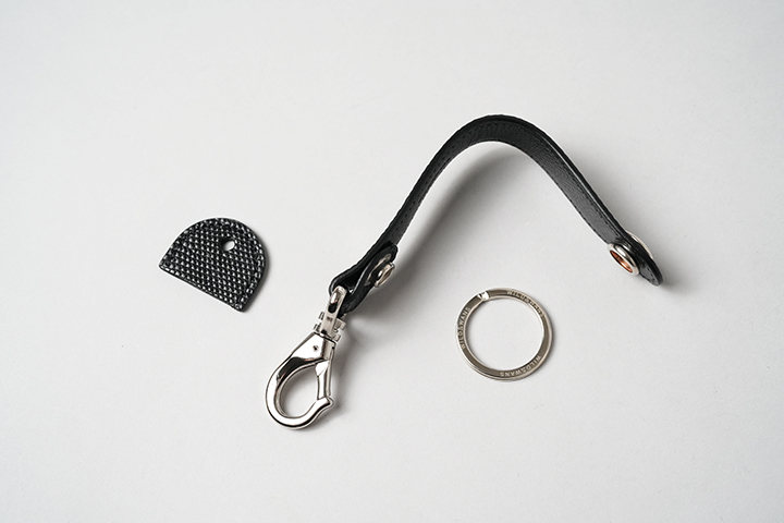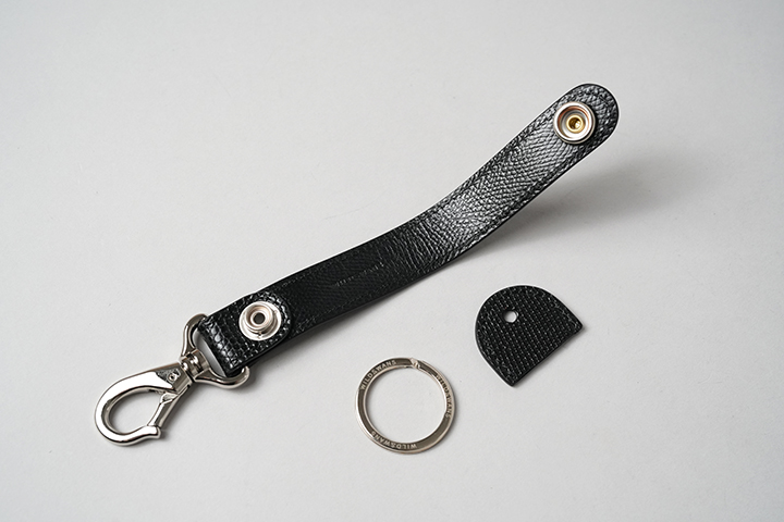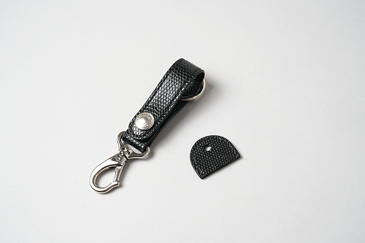 BRANCHⅡはWILDSWANSで長年製作してきたBRANCHの改良版として2024年にリリースされました。変更点としては、帯先端のナスカンパーツ金具と付属する二重リングです。まずナスカンパーツに関しましては、金属内部にバネを内蔵した新しいパーツに変更することで、装着、着脱が容易にできるようになりました。先端の金具は動きに合わせて回転する仕様となるため、外から干渉が生じた場合も金具及びアイテムへの負荷が掛かりにくくなっています。ナスカンパーツは、ベルトループや鞄のハンドルまたは金具などに接続をする想定です。二重リングについては、従来のものより若干サイズを大きくしたイタリア製の金具となり、こちらも従来のパーツに比べて装着と着脱が容易になります。こちらにはカギを複数装着して使用して頂きます。なお、帯を留める7050番ホックは従来のモデルから変更のない金具パーツとなります。帯部分については表側がリザード、内側にブラックの型押し過去を施したサドルプルアップを組み合わせています。また、付属のキーキャップの外装は表裏ともにリザード仕様です。当シリーズのなかでは一番小さなアイテムですが、貴重なリザードを比較的手軽にお楽しみ頂けます。また、ご自身用はもちろん、プレゼント用にもおすすめなアイテムです。