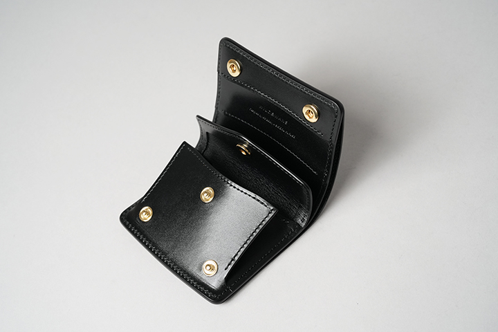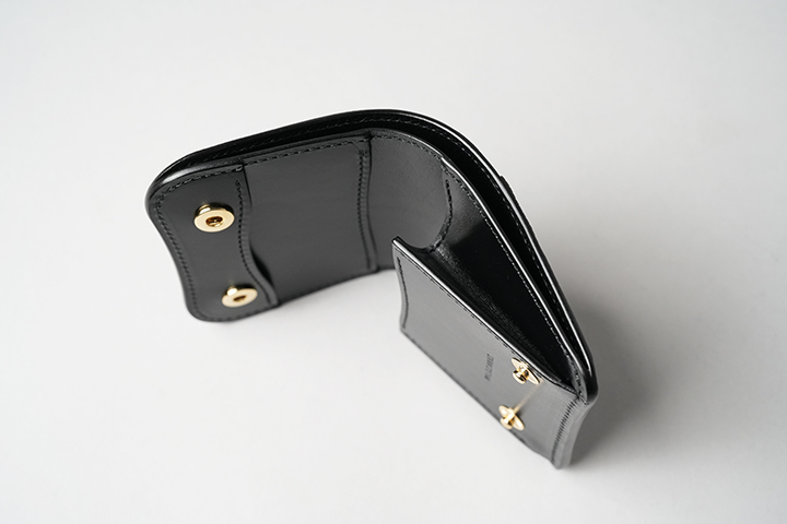 WILDSWANS とドメスティックブランドのCorbo.のチーフデザイナーである古瀬聡氏のコラボレーションシリーズ「Walkersシリーズ」の代表作kf‐003。まだミニ財布が全盛になる前から展開する貴重なアイテムです。PALM‐V2やCASAと異なり、フラップから背面にかけてポケットなどが一切なく、すきっりとした外観が特徴です。kf‐003もフラップとその下のパーツに段差を設けているので、指がフラップへ自然にかかるように工夫されています。内装は専用フラップ付きのコインケースと本体サイドに設けた札室からなるオーソドックスな仕様です。なお、カードはコインケース内の仕切りの奥に2~3枚、コインケースの背面に1枚収納することができます。ブラックのリザードをまとうことで、よりスマートな風貌となったkf‐003にもご注目ください。
