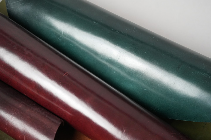 繊維層を削り出すという特異な製法ゆえ、その使用方法も一般的な皮革と異なります。例えばサドルプルアップのような牛革において、製品の外観となるのは皮革表面であり、いわゆるギン面(皮革表面)です。しかしシェルコードバンの場合はこの逆で、製作にあたってはギン面の裏側、つまり一般的には皮革の裏側にあたる面を使用します。
