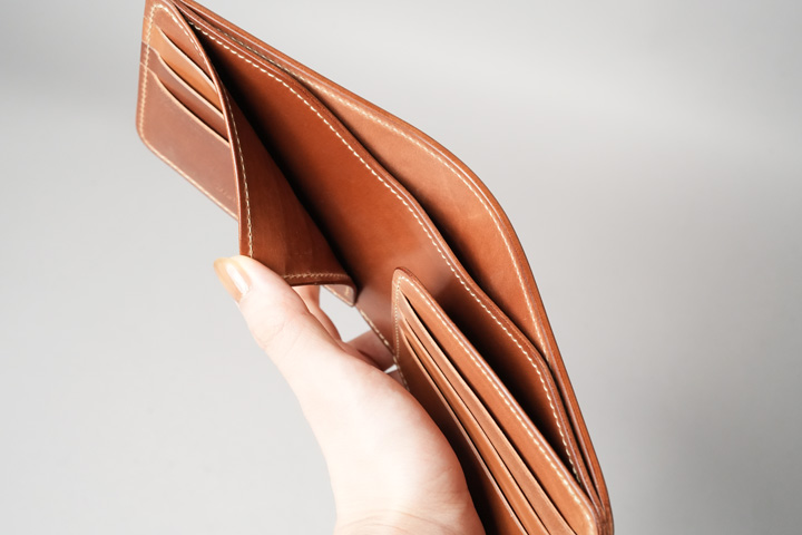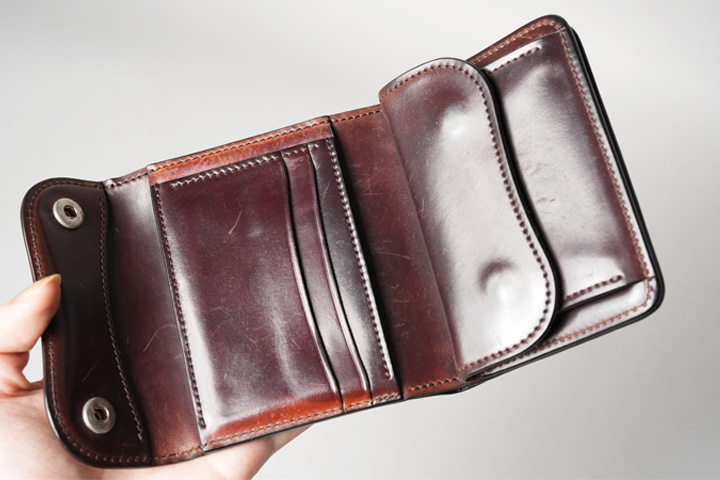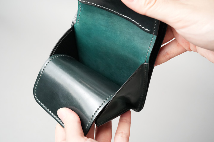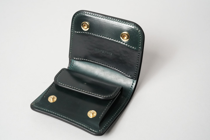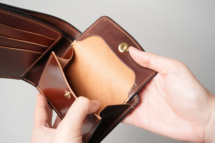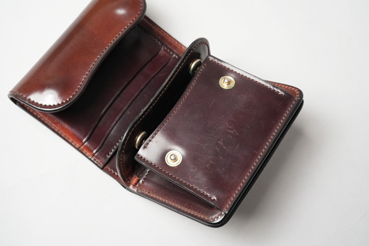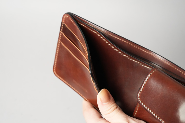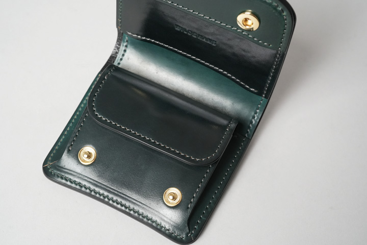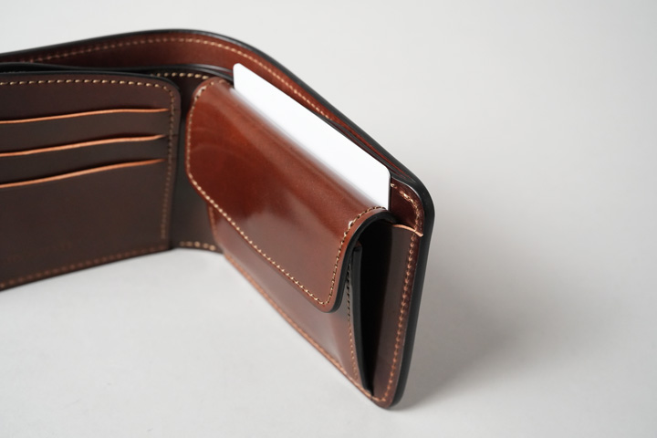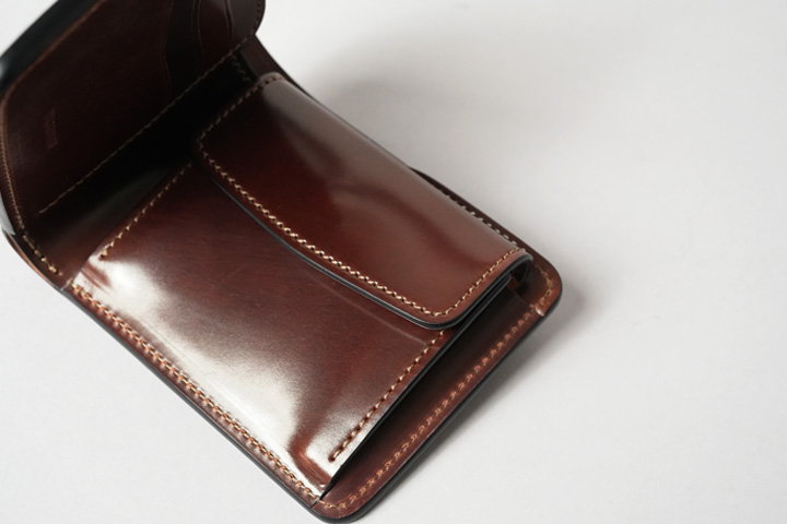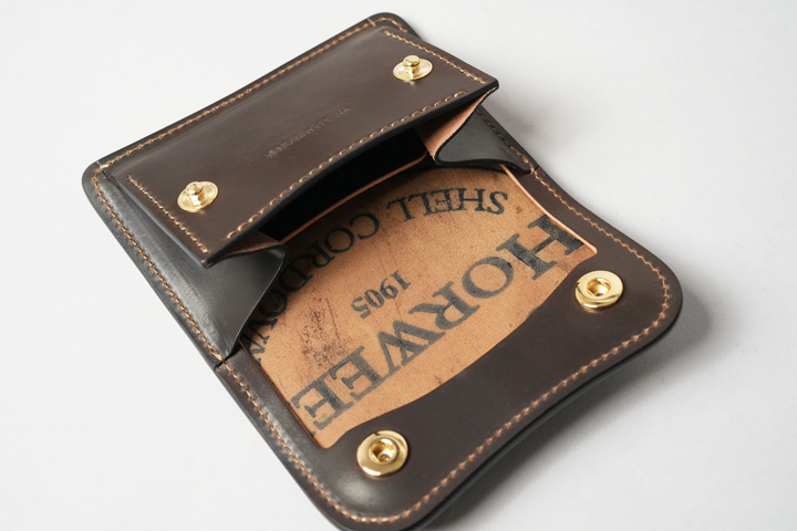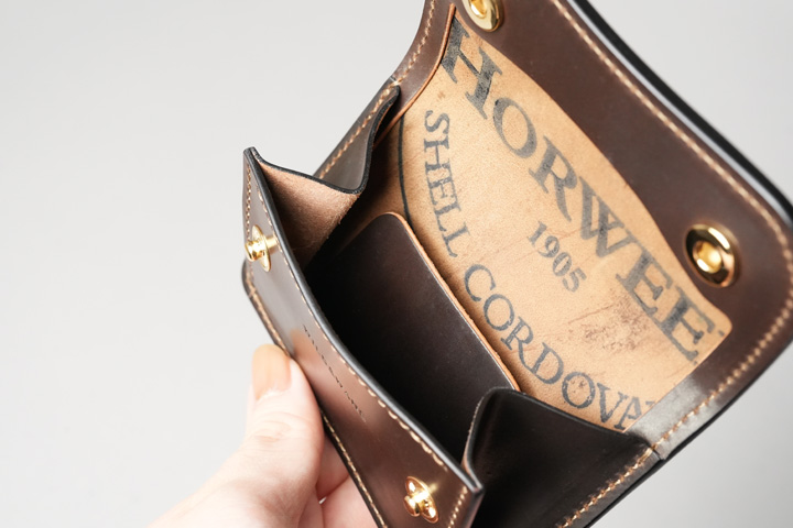 内装左にはカード収納部、右にはコインケースを設けています。すべてシェルコードバンで作り込まれた内装は圧巻の一言です。