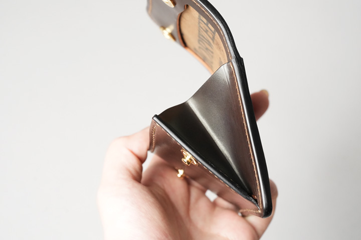 本体側面のマチも同様です。外観から内装まですべてがシェルコードバンに覆われ、手のひら程のサイズにもかかわらず、ただならぬ存在感があります。小さなボディに特別感がたっぷりと詰まった多機能コインケース、ぜひご検討ください。