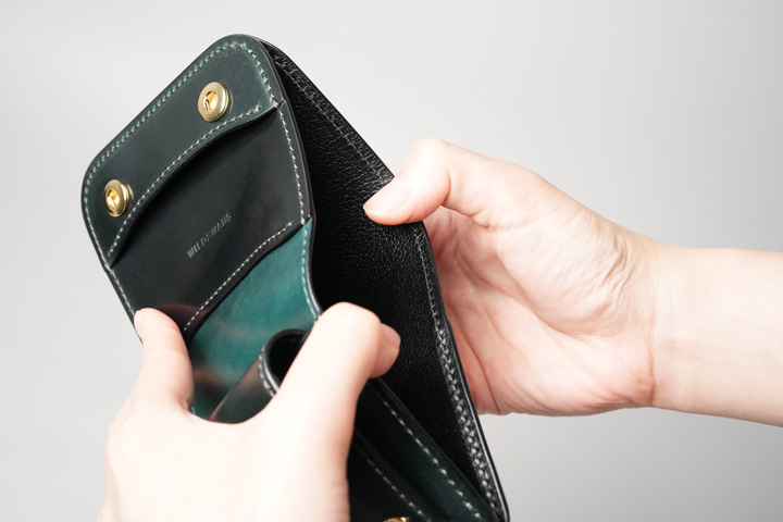 コインケースのフラップは可動式になっており、手前に引っ張ることで背面側のスペースがあらわれます。背面側はカード類の収納を想定しており、10枚前後の収納が可能です。コインケース内の空間を仕切りつつ、収納量によって前後に可動する仕組みです。