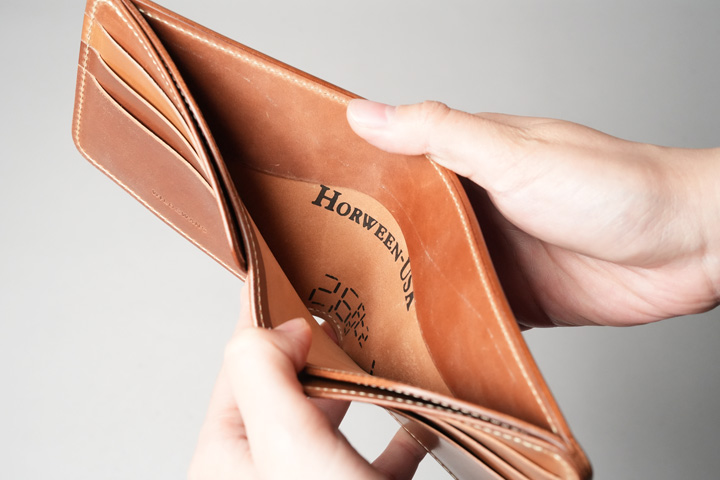 そして札室内にはホーウィン社のスタンプが。古き良き二つ折り財布の魅力が最大限に引き出され、ムードたっぷりに仕上がりました。どこか懐かしい、懐古心をくすぐる二つ折り財布です。