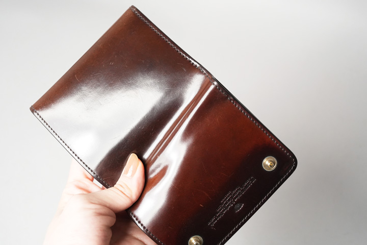 こちらは3年ほど使用したシェルコードバン/ENO/ブラックです。使用を経て光沢はさらに鋭さを増し、透明感にも磨きがかかったようです。日差しに晒していた経緯もあってか、黒の中にうっすらと茶色味も見受けられます。
