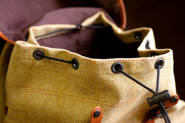フラップを開けると鞄の口部分は巾着状になっていますので、荷物の容量に合わせて絞ったり緩めたりして調節します。毎回の開け閉めに耐えられる様、強度が高く耐久性のある太目のナイロン紐を使用しています。