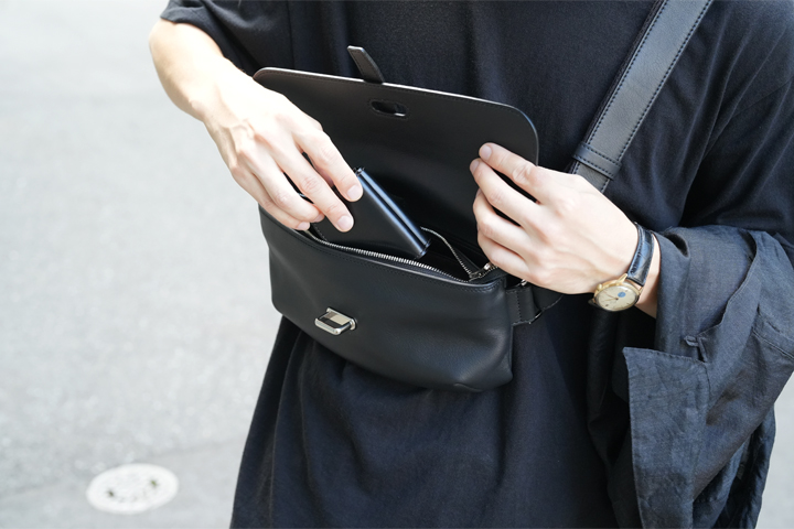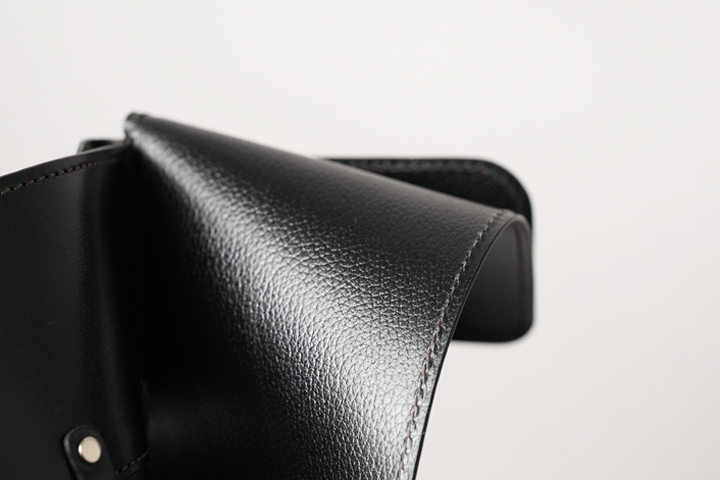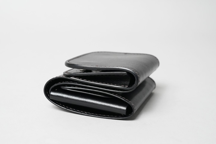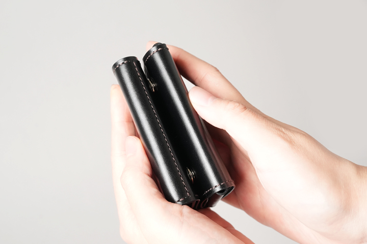 コバが連なった側面は三つ折り財布のENOを彷彿とさせますが、皮革を巻いたというよりも折り畳んだような、S字型のカーブを描いています。