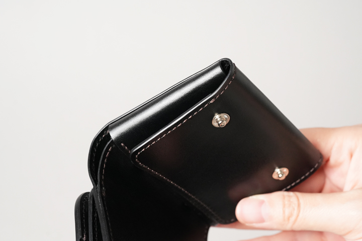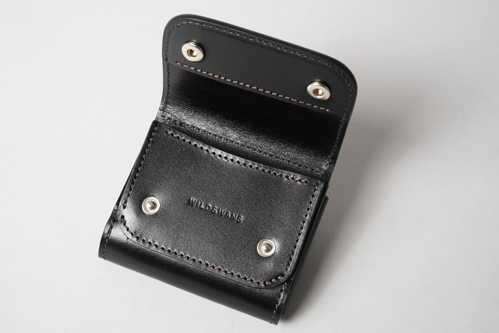 WILDSWANS 製品の中では珍しく、コインケースは製品の外側に面しています。小ぶりな本体に合わせて従来よりも小さなホックを使用しており、製品の軽量化の一因となっています。ブランドのロゴは、コインケースの前身部分に刻印されています。