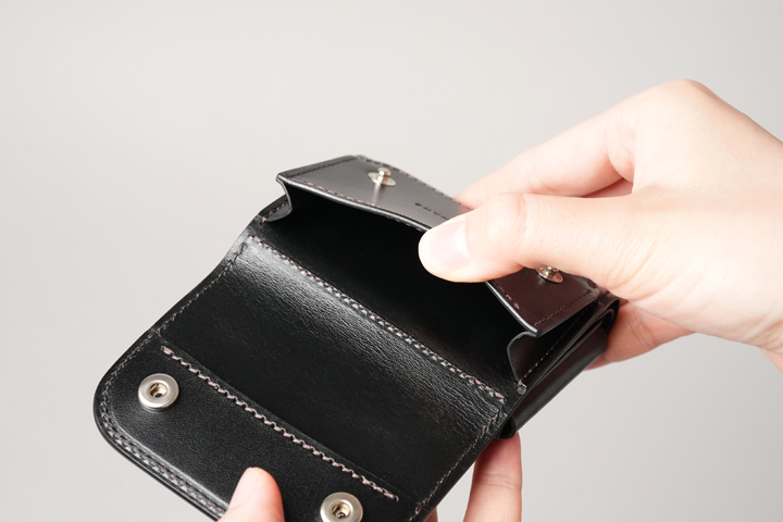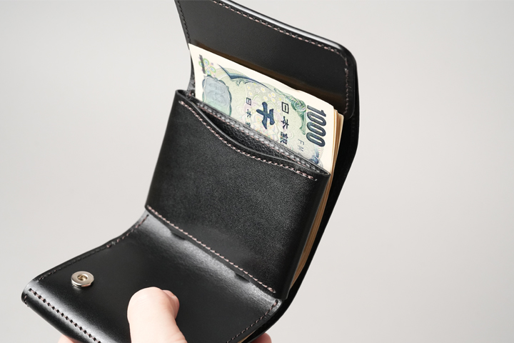 一室構造の札室ではなく札ばさみ型の収納スペースにすることで、使用する皮革量が減っています。開口部はあおりポケット状に縫製されているため、軽やかでスピーディな使用感がミニウォレットと好相性です。上の画像では20枚の紙幣を収めており、収納力も申し分ありません。
