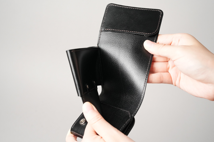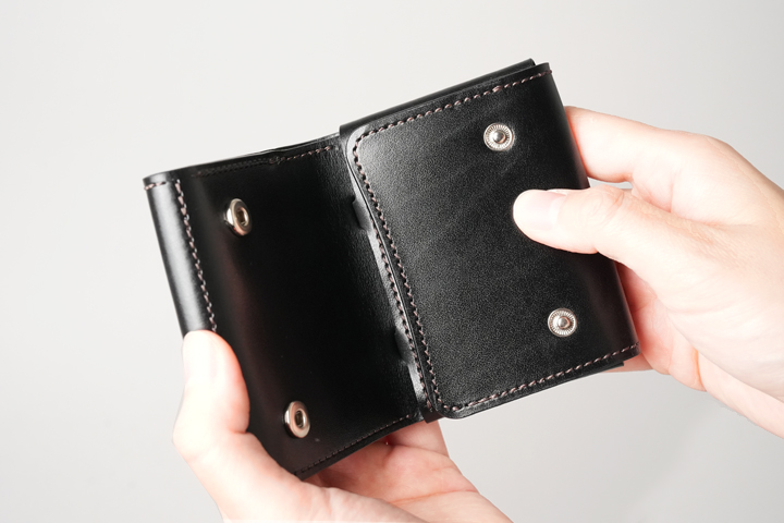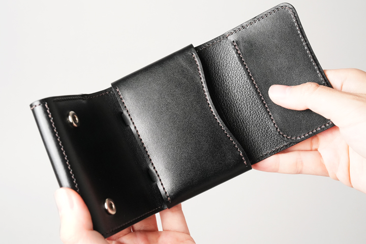 2か所あるホックをすべて解除してみました。全長だけで言えば長財布と同程度の長さがありますが、耐久性を損なわない程度に皮革の厚みを調整し、折り紙のように折り畳まれているのです。