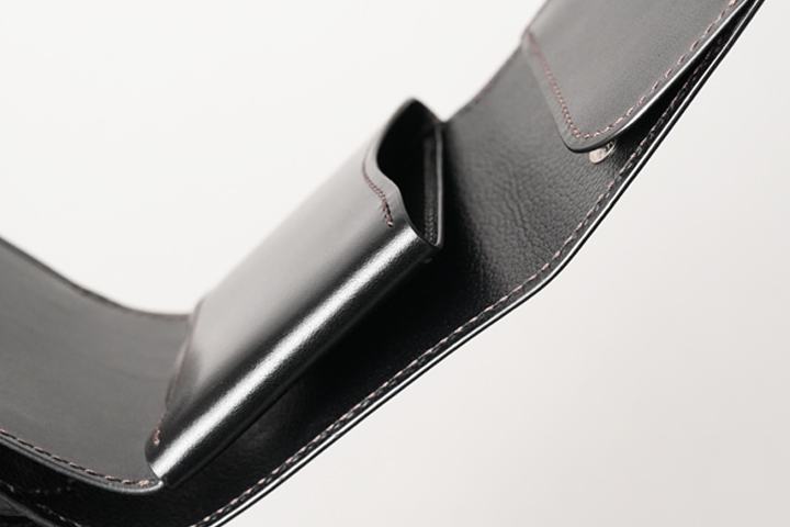 側面がカーブしたこの形、新鮮に思う方も多いかと思います。一般的なカードポケットは、革パーツを四方に縫い合わせるためにその分の縫い代(ぬいしろ)が生じます。つまりカード寸+αの採寸が必要でしたが、カードを包み込む構造をとることで必要最低限の採寸に収まっており、軽量化と同時に最小化も叶った収納部となっています。