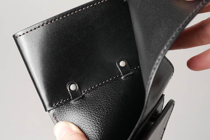 財布に限らず、コンパクトな革製品の製作において避けては通れない難題があります。皮革の厚みです。折り曲げづらく入れづらく、皮革が肉厚で堅牢であるほど、耐久性と反比例して使用感が落ちやすくなります。皮革同士を貼り合わせずに(裏貼りをせずに)、一枚革のパーツでつくればこの問題は解消されますが、裏貼りを施したパーツに比べて著しく耐久性が劣ってしまいます。
