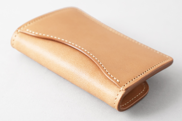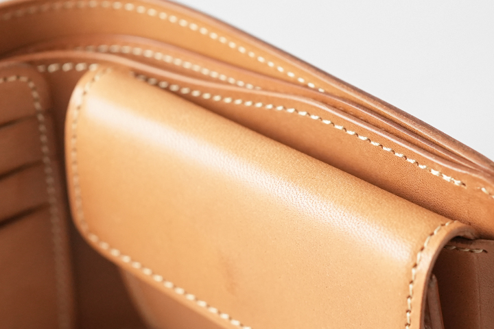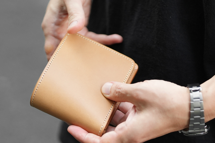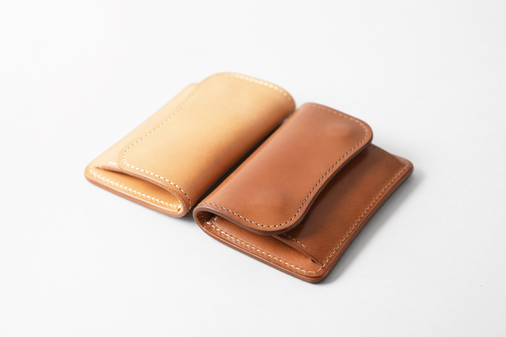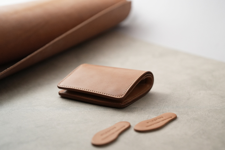 仕上がった皮革は頑強で、染色を行っていないヌメ革のために経年変化もじっくりとお愉しみ頂けます。