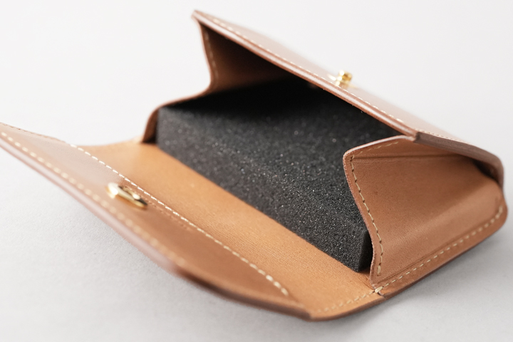 奥のスペース(黒いスポンジが入っている部分)は幅が広くなっており、こちらに名刺やカードを収納致します。 収納容量は名刺であれば約30枚、プラスチックカードであれば15枚程度の収納が可能です。 さらにマチの手前側はその構造上スペースが出来ますが、ここに畳んだ紙幣や硬貨を収めることが出来ます。