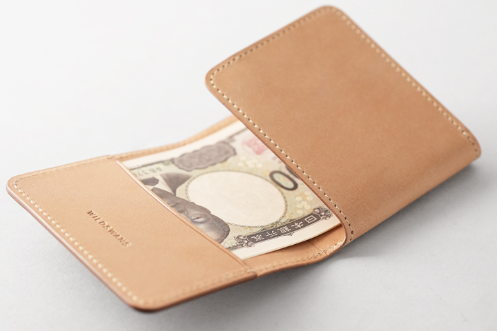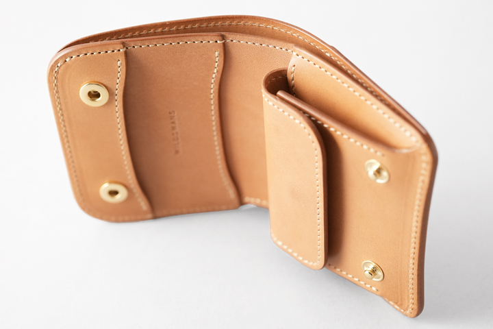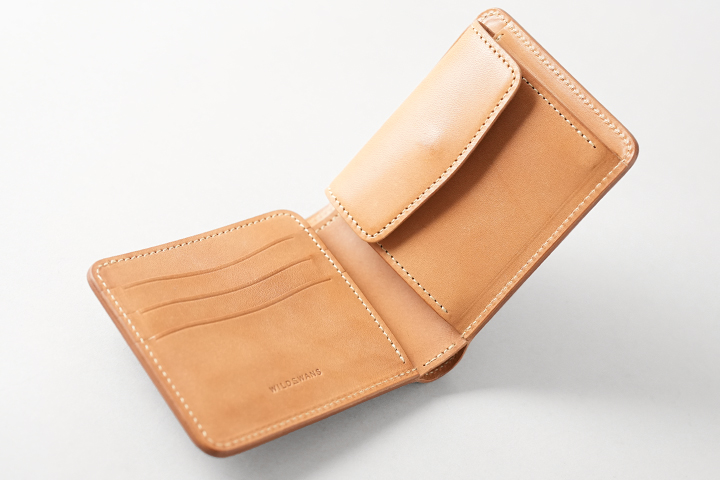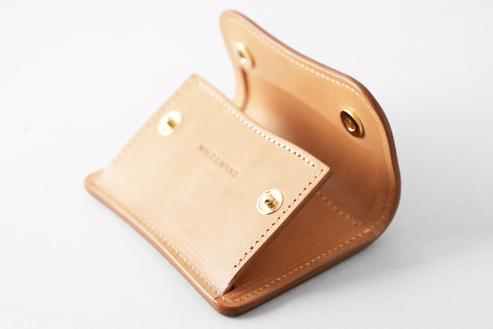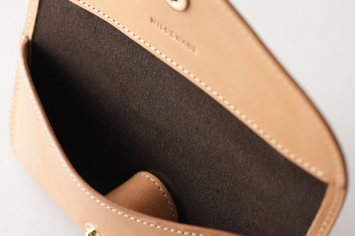 WILDSWANSのミニ財布系のアイテムは背面にカードポケットが定番ですが、このモデルは外装に収納部を持たず、一枚革のシンプルな外装が特徴です。
