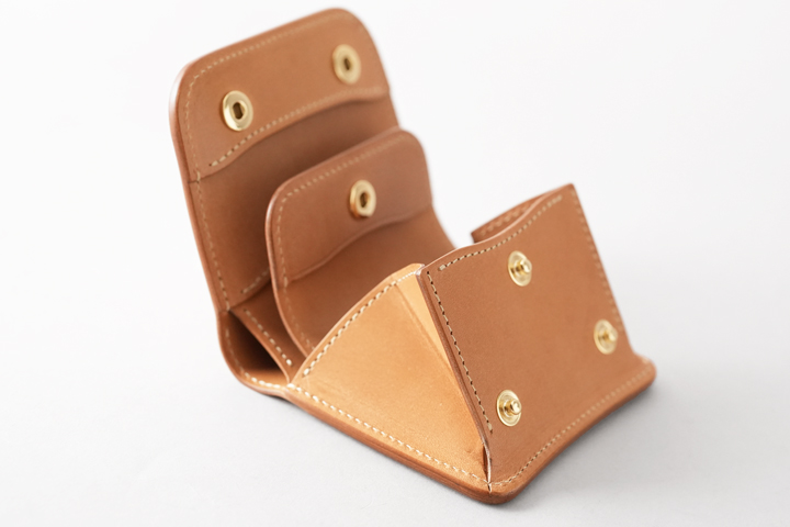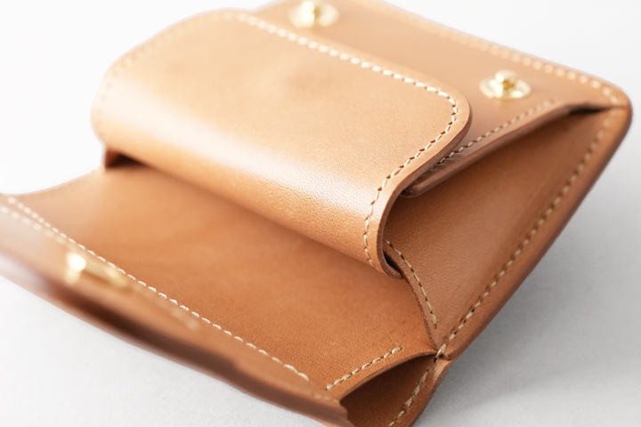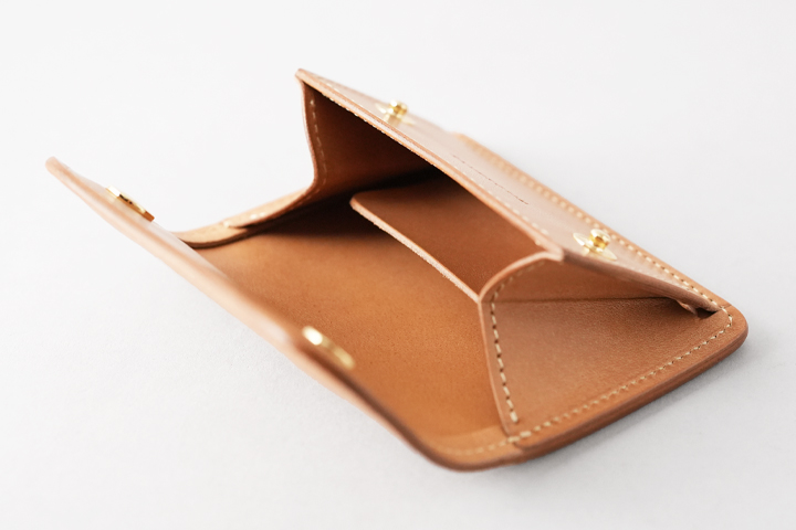 大まかに言えばフラップの付いたコインケースですが、背面にはカードポケットが一つ、また左右にマチの付いたメイン収納部のコインケースには仕切りパーツが設けられ、パーツ裏にカード類や三つ折りの紙幣を挟んで収納することが出来ます。
