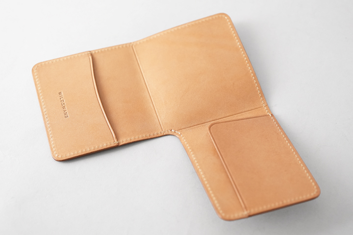 WILDSWANSの名刺入れには珍しいフラップ式のホック、フラップ裏側には小さなメモなどを収納可能なポケットを備えています。 メイン収納部は少し変わった形状のマチが左右に設けられており、手前と奥のスペースでそれぞれ幅が異なります。