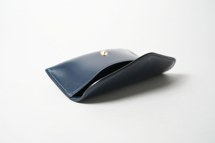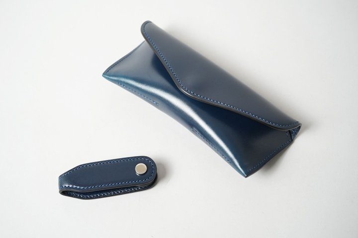 This OPTICAL CASE is a collaboration with Kaneko Eyeglasses, featuring a single piece of leather wrapping around the glasses. The flap is fastened with a hook, and it incorporates rounded details typical of Wildswans. The interior suede and the fixed leather part protect your glasses, with an additional small pocket inside the flap for an eyeglass wipe.