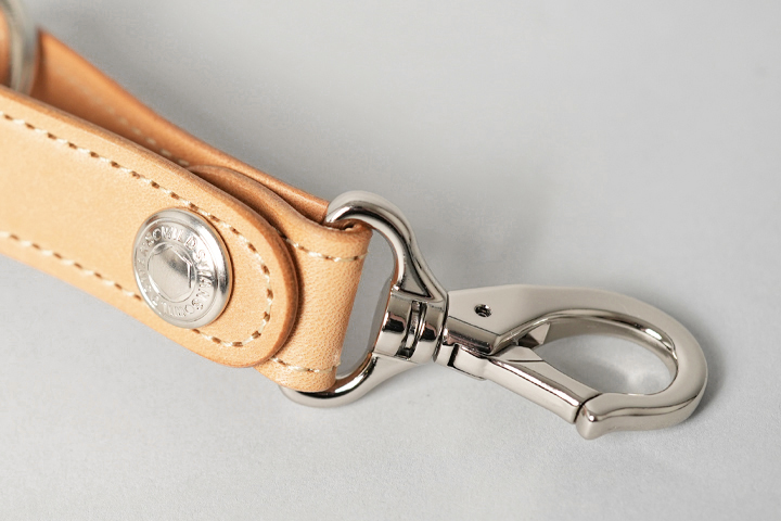 ハトメ付きのTONGUEはフルバスタンシリーズでは初登場となります。ハトメ付きであることの強みは、別売りの金具類を組み合わせることで携帯性の幅が大きいという点です。カラビナキーリングとレザーストラップLEGAREを繋げると首から下げての持ち運びや、鞄の中での紛失防止に役立ちます。
