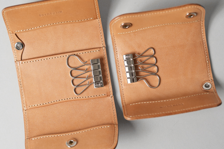 どちらも一枚革を使用した筒状タイプでスッと手に馴染むコンパクトな設計です。WILDSWANS特有の指をかけやすく開きやすい流線のデザインによって、可愛らしい印象もあります。その他の共通した仕様として、シルバーのホックと右下へのハトメ加工、内装にamiet社の4連キーフックが取り付けられています。キーフックは大が1つ、小が3つになっており、使い分けができるようになっています。