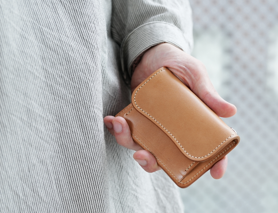 主な仕様は外装にカードポケット1室、内装に大きなマチを設けたフラップ付きのコインケース、サイドから出し入れする札室となっています。TONGUEと同様に、外装のカードポケットには使用頻度の高いカードの収納にご利用ください。フラップ付きのコインケースは傾けながら開いても中身がこぼれる心配はありません。大きなマチによってプラスチック製カードは最大6枚ほど、コインは最大20枚ほど持ち運ぶことができます。手のひらサイズの財布ですが札室は余裕を持ったサイズ設計になっており、さらに総革仕様であることから日本紙幣の出し入れが容易です。 扱いやすい形で現金派の方にもキャッシュレス派の方にも十分な容量を持っていますので、ご自身用はもちろんのこと、記念日などの贈り物にもおすすめのアイテムです。