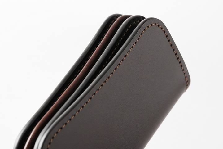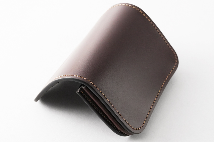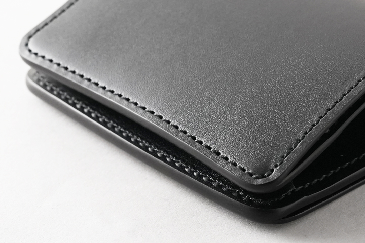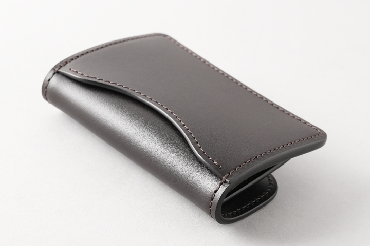 重層のコバが特長的な名刺入れです。 フラップは留め具がなく新品時は自然と開いたままですが、ご使用頂くにつれて徐々に閉じて参ります。メインの収納部は手前のマチなしポケットに1枚、奥のスペースに60枚前後の名刺を収納可能です。 GENERALのマチは通しマチをベースに改良を加えた特殊な構造で、外周のマチが伸縮して容量が変化します。最大では名刺60枚程度を収納可能です。