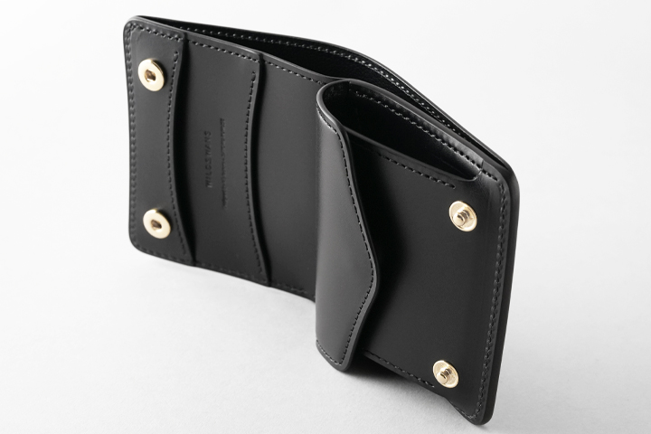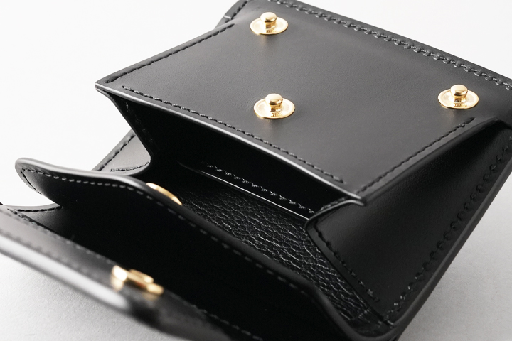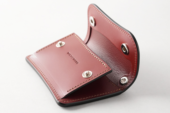 WILDSWANS定番の、機能的なコインケースです。 素早く・確実に開閉が可能な2点のホック付きのフラップを備え、内部のコインケースは左右のマチによって容量豊富です。 本体背面のマチなしポケットやコインケース内の仕切りパーツによって、カードや畳んだ紙幣なども収納出来るため、ポケットサイズながらお財布、パスケース、カードケースなど様々な用途に対応致します。
