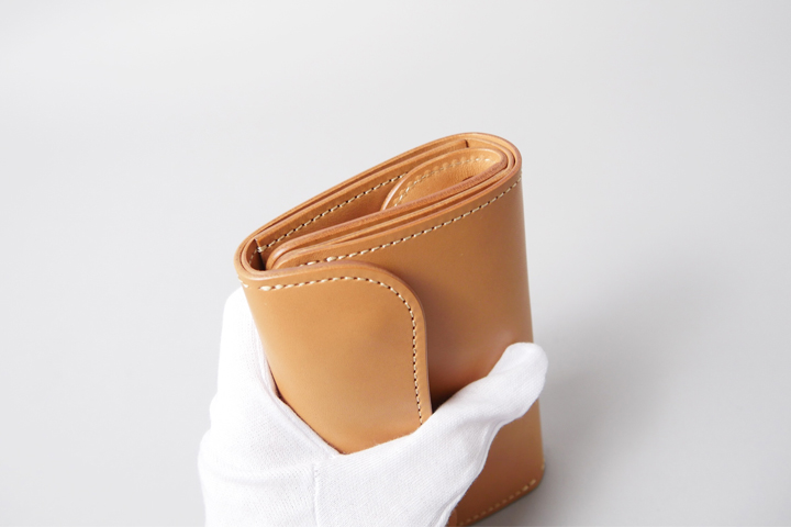 The BYRNE is a medium-sized tri-fold wallet with high storage capacity. It has five card shelves and three card compartments (two compartments on the left and right side of the back side of the card shelves + one compartment behind the coin case), so many cards can be stored.