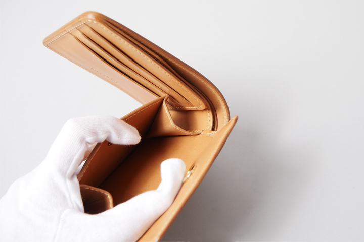 On the right side of the interior, there is a flap-type coin case with a card pocket on the back side of the coin case.