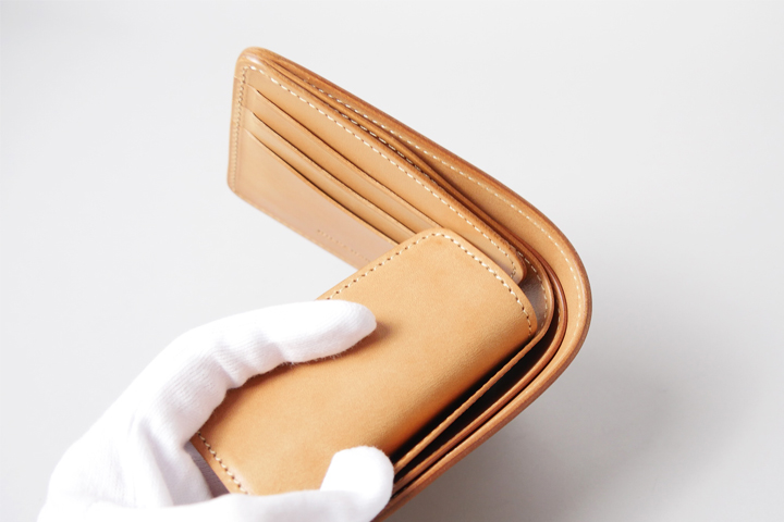 The large-capacity coin case has a partition where you can also store cards. The coin case is separate from the main body, and when seen from the side, the main body and coin pocket overlap, creating a beautiful two-layered cover.