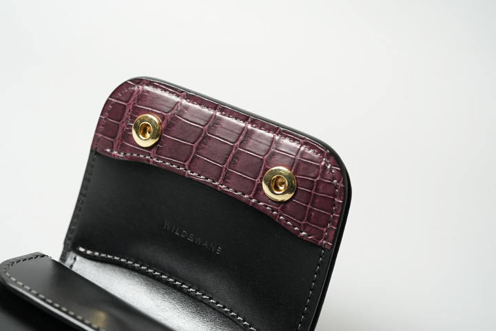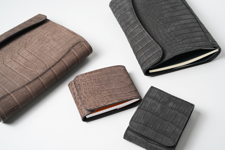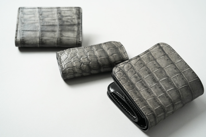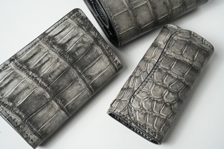 クロコダイルの中でも最高級に位置するポロサスを天然の墨で染め上げた神秘的なシリーズ。水墨画を思わせる静謐(せいひつ)な空気をまとっています。染まり具合が強すぎない分、使い込んだ時の色味の変化も楽しみです。